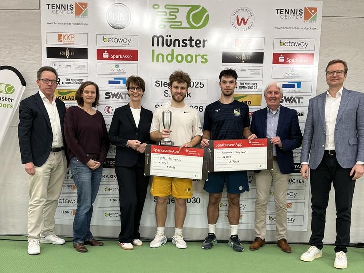 v.l.: Cord Witkowski (Presse), Ruth Zeddies (stellvertretende Bezirksbürgermeisterin), Mechthild Pieter (Vorstandsvertreterin der Sparlasse Müsterland Ost), Moritz Hoffmann (Sieger), Alexander Skrivpaev (Finalist), Robert Hampe (DTB-Vizepräsident), Prof. Dr. Dennis Heitmann (Turnierdirektor)
